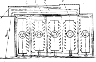Более высокую плотность заправки имеют сопловые сушилки с вертикальной проводкой ткани. В СССР такого типа машины СП-120-1 выпускались для сушки напечатанных тканей, которые следует высушить, не допустив смазывания краски, что удается при помощи П-образной проводки ткани со спиральной заправкой. Схема сушилки представлена на рис. 9. Она представляет собой камеру 4, выполненную из металлических щитов, заполненных стекловолокном. На опорах крепятся направляющие ролики 2, между которыми установлены сопловые короба 1. В камере сушилки расположены пять тепловентиляционных блоков, имеющих по одному осевому вентилятору и по два пластинчатых калорифера на каждый короб с соплами. Пар подводится отдельно к каждому калориферу, но конденсат отводится одним общим горшком, однако паро- и конденсатопроводы выполнены так, что обеспечивается продувка каждого тепловентиляционного блока. В состав сушилки также входят: охладительная камера 3, тянульная пара, поворотное устройство и роликовый укладчик (на рисунке они не показаны).