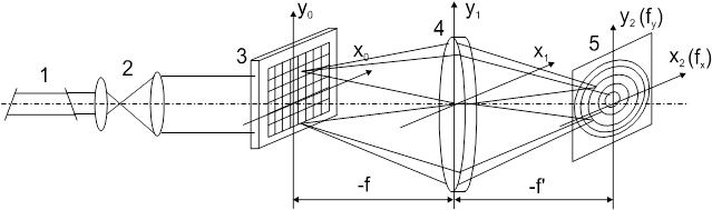 . На входном транспаранте 3 световая волна дифрагирует, и фурье-объективом 4 в задней плоскости 5 формируется дифракционное изображение исследуемого сигнала, которое является его фурье-образом и описывается выражением