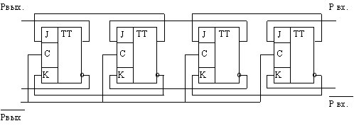 Передача от триггера Тi и изменение его состояния не могут проходить одновременно. В данном курсовом проекте эта трудность исключается за счет использования синхронных двухступенчатых JK-триггеров с динамическим управлением записью. Внутренняя организация таких триггерных схем предусматривает разделение во времени этапов приема входной информации и смены выходной. В них по переднему фронту синхронизирующего сигнала происходит прием информации, а по заднему - изменение состояния.