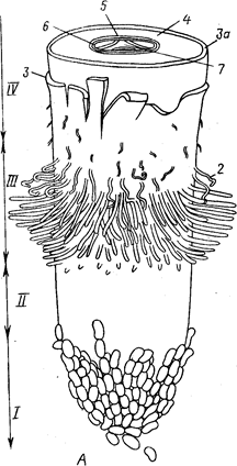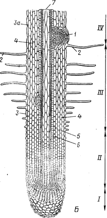 Рис.2 Общий вид {А) и продольный срез (5) корневого окончания (схема). 1— корневой чехлик; 11 - зона роста и растяжения; ///— зона корневых волосков, или зона всасывания; IV— начало зоны проведения (в этой зоне также закладываются боковые корни):