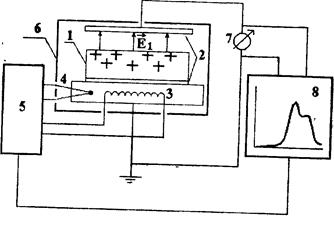 Рис. 27. Регистрация тока термостимулированной разрядки в условиях «разомкнутой» цепи- 1 - электрет; 2 - электроды; 3 - измерительная камера; 4 - спираль нагревателя; 5 - термопара, 6 - регулятор температуры; 7 - электрометр; 8 - двухкоординатный потенциометр.