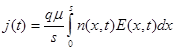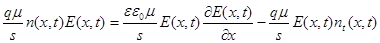 где q[п(х,t)+пt(х,t)]=ρ(х,t) - плотность заряда в пленке. Умножим обе части на Е(х,t) и μ, поделим на s и придем к выражению;