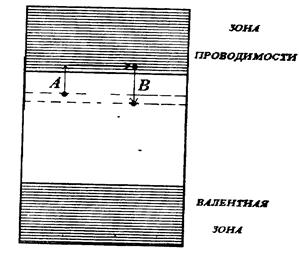 Рис 33 Явления делокализации и повторного захвата неравновесного носителя заряда на энергетической диаграмме. А -делокализация (освобождение) носителя с ловушки в зону проводимости, В - повторный захват