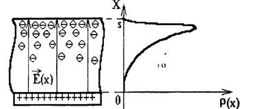 Если электрет имеет пространственный (объемный) заряд, плотность р(х) которого зависит только от одной координаты х (см. рис. 8), то электрическое поле внутри не будет однородным, так как напряженность будет зависеть от х. В