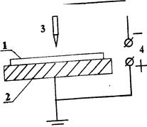 Рис.9 Электризация в коронном разряде: 1 - диэлектрическая пленка, 2 - металлический электрод;3 -игла, 4-