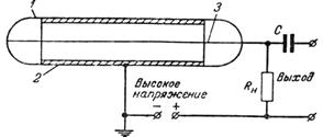 По своему устройству счетчик является своеобразным конденсатором – он состоит обычно из двух электродов. Форма электродов, как правило, цилиндрическая. Внутренним электродом служит тонкая вольфрамовая (можно железо, или др. металл) нить диаметром 0,1-0,5 мм. Эта нить натянута вдоль оси второго электрода – стеклянного, покрытого с внутренней стороны проводящим слоем, или металлического цилиндра диаметром 1-3 см (рис.1).
