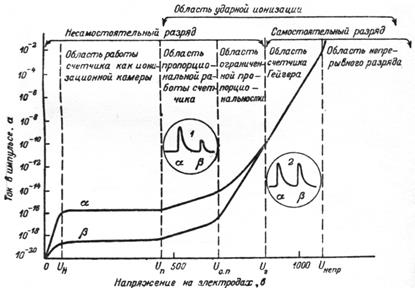 Рассмотрим более подробно показанную на рисунке 2 зависимость величины тока импульса от режима работы счетчика, т.е. от приложенного к электродам напряжения при попадании частицы с определенной кинетической энергией.