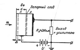 Пусть со стороны n-германия попадает α-частица. В небольшом слое Δ толщиной 10-20 мк она затормозится, полностью отдав свою энергию на образование пар электрон-дырка. Дырки через запорный слой легко проходят, и возникает ток в замкнутой цепи кристалл - сопротивление R - батарея.α Так как при прохождении тока через фотодиод на внешнем сопротивлении нагрузки падает почти все напряжение источника тока, удается получить достаточно большие импульсы. Следует также отметить, что такие счетчики имеют «темновой ток», т.е. ток в отсутствии облучения, его величина достигает нескольких микроампер.
