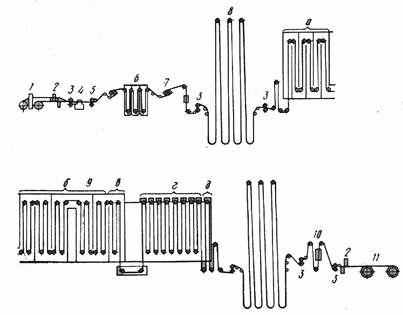 8 — петлевые ямы; 9 — башенная печь; 10 — установка Для нанесения защитного покрытия; 11 — моталка.