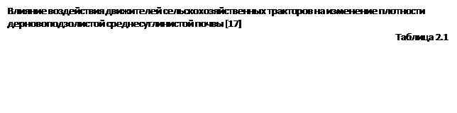 Труды [8, 10, 14] показывают, что в последнее время использование гусеничных тракторов в сельском хозяйстве стало больше, чем колесных. В таблице 2.1 приведены результаты исследования уплотнений почвы после проходов тракторов с различными типами движителей. Из таблицы следует, что средине и максимальные давления на почву гусеничных сельскохозяйственных тракторов находятся с пределах, соответственно, 0,04–0,06 МПа и 0,154–0,240 МПа [16].