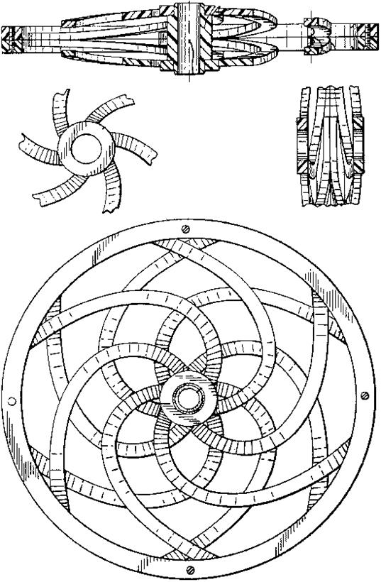 Выбор специфической конфигурации или модели двойных спиралевидных деталей в изобретенном колесном устройстве позволяет, по крайней мере, добиться искомого распределения усилий или достичь требуемой в ряде задач поворачиваемости и сцепления. Таким образом, горные велосипедные шины могут нуждаться в соприкосновении обоих сторон спиралевидных элементов для передачи наибольшей гибкости и улучшенной упругости, поскольку в значительной степени идентичность или согласованность блоков спиральных шестерен может придать большую поворачиваемость единичному колесу лопастного типа роликовых коньков, т.е. так называемым роликовым лезвиям.