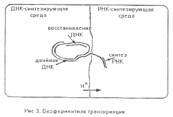 Мы предположили, что решающим фактором стало различие pH в соседних участках внутренней среды пробионта - так называемая компартментализация. Причиной параметрического различия сред был перенос протонов через каталитически активные пленки. (Аналогичные процессы в живых клетках - трансмембранные протонные переносы открыл английский ученый П.Митчел.) В одном из компартментов пробионта создавались условия, благоприятные для синтеза РНК, а в другом - ДНК. Транскрипция начиналась с рассоединения двойной спирали ДНК и переноса одной из ее цепей через мембрану, разделяющую две среды. Эта цепь становилась матрицей для синтеза РНК, а другая оставалась в прежнем компартменте и служила матрицей для восстановления парной ДНК (Рис. 3). Можно предположить, что и у живых клеток важным условием транскрипции служит компартментализация при переносе протонов через мембрану, содержащую рибосомы.