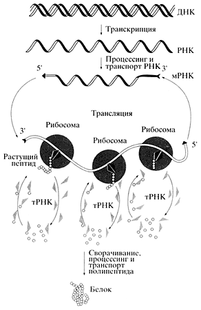 которые образуют структурный каркас и функциональные центры универсальных белок-синтезирующих частиц - рибосом. Именно рибосомные РНК ответственны - как в структурном, так и в функциональном отношении - за формирование ультрамикроскопических молекулярных машин, называемых рибосомами. Рибосомы воспринимают генетическую информацию в виде молекул мРНК и, будучи запрограммированы последними, делают белки в точном соответствии с данной программой.