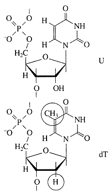 Рис. 2. Химические формулы остатков одного из рибонуклеотидов - уридиловой кислоты (U) и гомологичного ему дезоксирибонуклеотида - тимидиловой кислоты (dT)