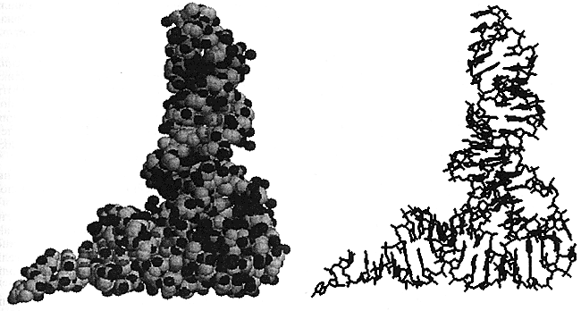 Рис. 3. Атомная (слева) и скелетная (справа) модели фенилаланиновой тРНК дрожжей