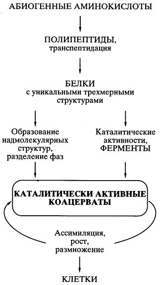 Основным ее постулатом было то, что спонтанно возникавшие в первичном "бульоне" белковоподобные соединения объединялись" в коацерватные капли - обособленные коллоидные системы (золи), плавающие в более разбавленном водном растворе. Это давало главную предпосылку возникновения организмов - обособление некой биохимической системы от окружающей среды, ее компартментализацию. Так как некоторые белковоподобные соединения коацерватных капель могли обладать каталитической активностью, то появлялась возможность прохождения биохимических реакций синтеза внутри капель - возникало подобие ассимиляции, а значит, роста коацервата с последующим его распадом на части - размножением. Ассимилирующий, растущий и размножающийся делением коацерват рассматривался как прообраз живой клетки (рис. 5).