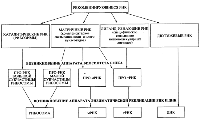Рис. 7. Схема эволюции и специализации молекул РНК в процессе перехода от древнего мира РНК к современному миру генетически детерминированного биосинтеза белков