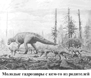 , к ней относится и множество более мелких, от страуса до курицы величиной, рептилий. Хищные динозавры строили “гнезда”, похожие, по-видимому, на гнезда современных аллигаторов, т.е. сгребали кучи из смеси растительного “мусора” и почвы. В эти кучи они откладывали сильно вытянутые – как у протоцератопсов – яйца, поверхность скорлупы которых была покрыта сложным “струйчатым” орнаментом из ребрышек и бугорков.