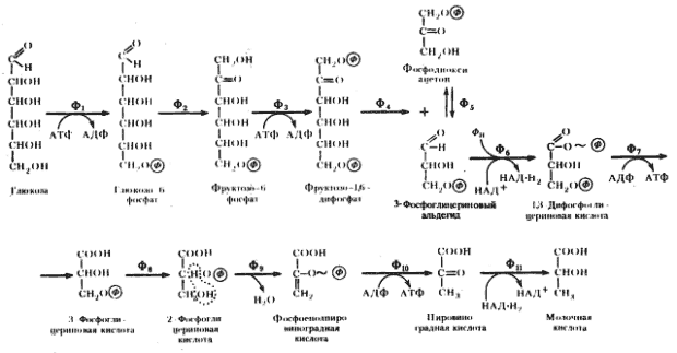 Рис. 53. Гомоферментативное молочнокислое брожение: Ф1 — гексокиназа; Ф2 — глюкозофосфатизомераза; Ф3 — фофсофруктокиназа; Ф4 — фруктозо-1,6-дифосфатальдолаза; Ф5 — триозофосфатизомераза; Ф6 — 3-ФГА-дегидрогеназа; Ф7 — фофсоглицерокиназа; Ф8 — фосфоглицеромутаза; Ф9 — енолаза; Ф10 — пируваткиназа; Ф11 — лактатдегиброгеназа (по Dagley, Nicholson, 1973) |