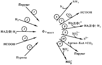 Рис. 59. Роль ферредоксина в метаболизме клостридиев: 1 — пируват:ферредоксин-оксидоредуктаза; 2 — гидрогеназа; 3 — ферредоксин: НАД (Ф)-оксидоредуктаза; 4 — формиатдегидрогеназа; 5 — ксантиндегидрогеназа; 6 — нитрогеназа; 7 — ферредоксин:CO2-оксидоредуктаза (возможно, это формиатдегидрогеназа, катализирующая реакцию 4 в обратном направлении); 8 — реакция 3, протекающая в обратном направлении; 9 — сульфатредуктаза; 10 — реакция 1, протекающая в обратном направлении; 11 — нитратредуктаза |