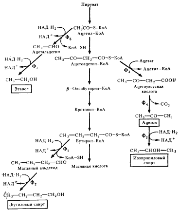 Некоторые клостридии (C. acetobutylicum, C. bejerinckii, C. cellobioparum и др.) при сбраживании сахаров наряду с кислотами накапливают в среде нейтральные продукты (бутиловый, изопропиловый, этиловый спирты, ацетон). Особенно много нейтральных продуктов образуется культурой C. acetobutylicum, что дало основание в свое время выделить как вариант маслянокислого брожения ацетоно-бутиловое брожение. У клостридиев, осуществляющих ацетоно-бутиловое брожение, образование масляной кислоты происходит на первом этапе брожения. По мере подкисления среды (до pH ниже 5) и повышения в ней концентрации жирных кислот индуцируется синтез ферментов, приводящих к накоплению нейтральных продуктов, в первую очередь н-бутанола и ацетона. н-Бутанол образуется из бутирил-КоА, предшественника масляной кислоты, в результате двух последовательных ферментативных реакций (рис. 60). Первая из них заключается в отщеплении кофермента А и одновременном гидрировании, приводящем к образованию масляного альдегида. Последующее его восстановление с помощью НАД-H2 приводит к появлению н-бутанола. Путь, ведущий к образованию ацетона, начинается с переноса от ацетоацетил-КоА кофермента А на ацетат. Декарбоксилирование ацетоуксусной кислоты приводит к образованию ацетона. Образование этанола происходит в результате двухступенчатого восстановления ацетил-КоА.