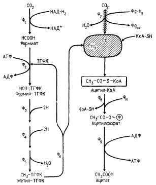 Вторая молекула CO2, углерод которой служит источником карбоксильной группы ацетата, при участии CO-дегидрогеназы восстанавливается до CO, оставаясь связанной с этим ферментом. CO-дегидрогеназа, ключевой фермент этого пути синтеза ацетата, имеет 3 центра, связывающие CH3-, CO-группы и кофермент А. Затем на ферменте осуществляется карбоксилирование метильной группы и взаимодействие образовавшейся ацетильной группы с коферментом А, приводящее к образованию ацетил-КоА. По характеру превращений, катализируемых CO-дегидрогеназой, фермент правильнее называть ацетил-КоА-синтазой. Дальнейшие превращения ацетил-КоА до ацетата, сопровождающиеся образованием АТФ, описаны ранее.