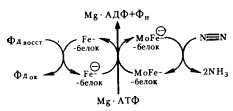 Для функционирования нитрогеназы необходим источник энергии в виде АТФ, ионы магния и восстановитель с низким окислительно-восстановительным потенциалом. У C. pasteurianum непосредственным донором электронов для восстановления N2 служит восстановленный ферредоксин, электроны с которого поступают сначала на Fe-белок нитрогеназы (рис. 63).