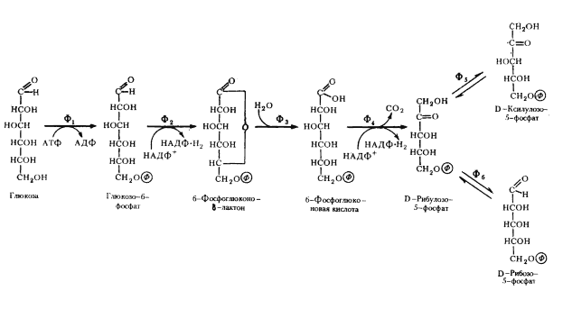 глюкозо-6-фосфат + 2НАДФ+ ® рибозо-5-фосфат + CO2 + 2НАДФ-Н2.
