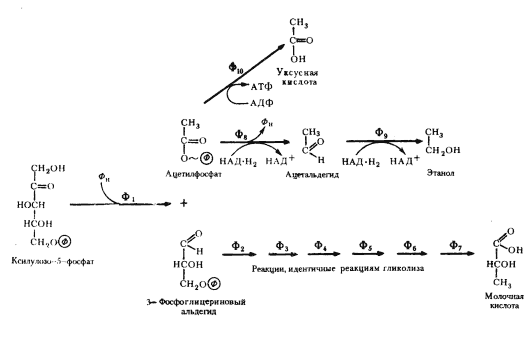 Изучение механизмов образования конечных продуктов брожения гетероферментативными молочнокислыми бактериями обнаружило, что они связаны с дальнейшими различными путями метаболизирования C2- и C3-фрагментов фосфокетолазной реакции. 3-ФГА претерпевает ряд ферментативных превращений, идентичных таковым гликолитического пути, и через пируват превращается в молочную кислоту. Судьба двухуглеродного фрагмента различна: двухступенчатое восстановление ацетилфосфата приводит к накоплению в среде этанола; окислительный путь превращения ацетилфосфата завершается образованием уксусной кислоты (рис. 65).