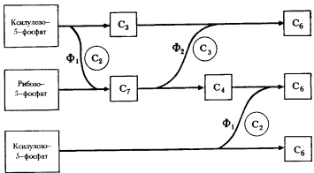 Но на этом пути эволюционное развитие окислительного пентозофосфатного пути расщепления углеводов не остановилось. Была сформирована последовательность реакций, "замыкающая" этот путь в цикл, в результате чего стала возможной полная деградация молекулы сахара. Исходными субстратами на этом пути служат пентозы, образующиеся из рибулозо-5-фосфата, ксилулозо-5-фосфата и рибозо-5-фосфата (см. рис. 64). При участии двух дополнительных ферментов — транскетолазы и трансальдолазы — осуществляется перенос C2- и C3-фрагментов между изомерными пентозо-5-фосфатами и продуктами их взаимопревращений (рис. 66). Сначала транскетолаза переносит C3-фрагмент от молекулы ксилулозо-5-фосфата на молекулу рибозо-5-фосфата, в результате чего образуется C7-сахар и C3-сахар — 3-ФГА. 3-ФГА, образующийся в транскетолазной реакции и, как известно, представляющий собой промежуточный продукт гликолитического пути, является первой точкой, в которой пересекаются эти пути.
