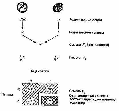 Мендель обозначал пары генов буквами; доминантные аллели— прописными, а рецессивные — строчными. На рис. 2.1 эти обозначения использованы для наглядного изображения результатов одного из его экспериментов и их истолкования. Мендель скрещивал растения гороха с гладкими (доминантный признак— R) и морщинистыми (рецессивный признак — г) семенами и получил в поколении F2 5474 гладких и 1850 морщинистых семян, то есть отношение гладких семян к морщинистым составляло 2,96: 1, что совпадает с предсказанным соотношением 3:1.