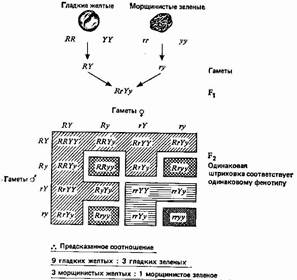 Рис. 2.2. Еще один эксперимент Менделя, в котором скрещивали растения, различающиеся по двум парам признаков.