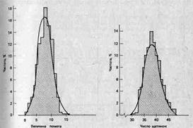Рис. 2.4. Частотное распределение величины помета у мышей и числа щетинок на вентральной поверхности брюшка у дрозофилы. В обоих случаях кривая распределения приближается к нормальной (гауссовой) кривой. (Futuyama D. J., Evolutionary Biology, Sinauer Associates, Massachusetts, 1979.)