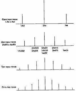 Допустим, что «сила» данного признака зависит от соотношения доминантных и рецессивных аллелей. В таком случае, чем больше число расщепляющихся локусов, определяющих этот признак, тем больше число возможных сочетаний доминантных и рецессивных признаков, а тем самым и число возможных фенотипических классов. (Strickberger M. W., Genetics, Macmillan, New York, 1968.)
