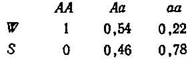 Отсюда (W и S набраны прописными, так как они обозначают генотипы, а не свойства генов; этого мы будем придерживаться по всей книге). Возвращаясь к начальным данным, можно получить новые частоты генотипов, установившиеся после отбора, из произведения исходных частот и значений W, приведя каждое из них к долям единицы путем деления на сумму этих отдельных членов. Эту сумму иногда обозначают через W, и она равна средней, по всем W.