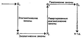 Рис. 4.1. Некое исходное распределение генов (Gi) дает определенные фенотипы (Pi) в соответствии с эпигенетическими законами. Распределение фенотипов изменяется в соответствии с экологическими законами (переходя в pz)- Эти фенотипы вносят в генофонд (Gj) гены, которые распределяются в соответствии с генетическими законами (Оз). В этой главе основное внимание уделено рассмотрению пути от генов (G) к фенотипам (Р).