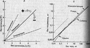 Рис. 4.2. Примеры аллометрии в теории (Л) и на практике (Б). Построенные в логарифмическом масштабе графики зависимости размеров одного органа (Y) от другого или от размеров организма в целом (X) часто имеют вид прямых. Если наклон этих прямых равен единице, то зависимость называют изометрической (для сравнения на рис. Б она изображена пунктиром); в этом случае X и Y увеличиваются в размерах с одинаковыми скоростями. Зависимость между весом кишечника и общим весом тела у млекопитающих и птиц примерно изометрична. Если наклон больше единицы, то зависимость положительно аллометрична и размеры Y увеличиваются быстрее, чем размеры X (например, данные по крысам). Когда наклон меньше единицы, то зависимость отрицательно аллометрична и Y увеличивается медленнее, чем X (например, данные по собакам). Такие графики можно строить для особей, принадлежащих к одному виду (например, данные по собакам и крысам), или для особей, принадлежащих к нескольким разным видам (например, данные по млекопитающим и птицам).