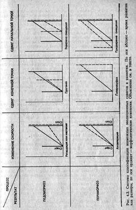 Нидхем (9) указывал, что как в принципе, так и практически относительные скорости и сроки наступления трех выделенных им фундаментальных процессов можно изменять и что такие регулировки оказывают глубокое влияние на конечный результат развития. Можно, например, экспериментально ускорить дифференцировку по отношению к росту и получить карликов (экспериментальная карликовость). У некоторых беспозвоночных можно подавить размножение и получить великанов (паразиты нередко кастрируют своих хозяев, что приводит к тому же результату). Если возможно искусственно разделить рост и развитие, то можно предполагать, что такая гетерохрония играет важную роль в эволюции. Мелкие мутации могли бы оказывать некоторое влияние на скорости и сроки роста органов и тканей, но сильно воздействовать на конечный результат — иными словами, небольшие изменения в а и (или) b могут иметь очень важные последствия для организации и морфологии взрослого организма.