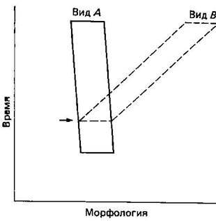 Рис. 5.2. Видообразование как постепенный процесс. После возникновения изоляции (горизонтальная стрелка) изолят (вид В) постепенно дивергирует от «родительского» вида А.