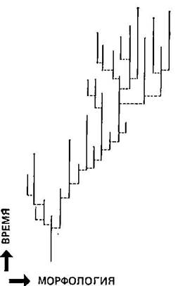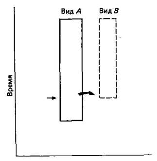 Рис. 5.4. Направление эволюции, создавшееся в результате дифференциального видообразования и выживания видов, а не в результате постепенных изменений. Виды возникают внезапно, а затем почти не изменяются. Сдвиг вправо обусловлен тем, что в этом направлении видообразование происходит чаще, а также тем, что виды с такими морфологическими признаками выживают дольше. По-видимому, возможно преобладание любого из этих процессов, то есть как дифференциального видообразования, так и вымирания.