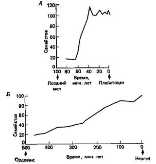 Рис. 5.5. Разнообразие семейств млекопитающих (А) и двустворчатых моллюсков (Б) на протяжении длительных периодов времени (19).