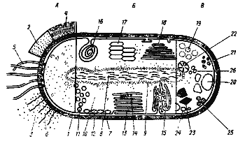 Рис. 4. Комбинированное изображение прокариотной клетки. А — поверхностные клеточные структуры и внеклеточные образования: 1 — клеточная стенка; 2 — капсула; 3 — слизистые выделения; 4 — чехол; 5 — жгутики; 6 — ворсинки; Б — цитоплазматические клеточные структуры: 7 — ЦПМ; 8 — нуклеоид; 9 — рибосомы; 10 — цитоплазма; 11 — хроматофоры; 12 — хлоросомы; 13 — пластинчатые тилакоиды; 14 — фикобилисомы; 15 — трубчатые тилакоиды; 16 — мезосома; 17 — аэросомы (газовые вакуоли); 18 — ламеллярные структуры; В — запасные вещества: 19 — полисахаридные гранулы; 20 — гранулы поли-b-оксимасляной кислоты; 21 — гранулы полифосфата; 22 — цианофициновые гранулы; 23 — карбоксисомы (полиэдральные тела); 24 — включения серы; 25 — жировые капли; 26 — углеводородные гранулы (по Schlegel, 1972) |