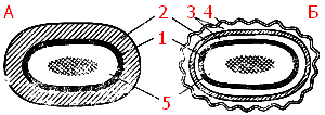 Рис. 5. Клеточная стенка грамположительных (А) и грамотрицательных (Б) эубактерий:1 — цитоплазматическая мембрана; 2 — пептидогликан; 3 — периплазматическое пространство; 4 — наружная мембрана: 5 — цитоплазма, в центре которой расположена ДНК |