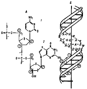 Рис. 16. Строение ДНК: А — фрагмент нити ДНК, образованной чередующимися остатками дезоксирибозы и фосфорной кислоты. К первому углеродному атому дезоксирибозы присоединено азотистое основание: 1 — цитозин; 2 — гуанин; Б — двойная спираль ДНК: Д — дезоксирибоза; Ф — фосфат; А — аденин; Т — тимин; Г — гуанин; Ц — цитозин |