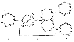 Рис. 17. Репликация кольцевой бактериальной хромосомы в двух направлениях. А — родительская молекула ДНК; Б — промежуточные репликативные формы; В — дочерние молекулы ДНК после завершения процесса репликации и расхождения: 1 — точка начала репликации; черными стрелками показано направление репликации |