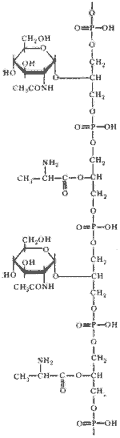 Рис. 8. Структурная формула глицеринтейхоевой кислоты. Содержит чередующиеся остатки D-аланина и N-ацетилглюкозамина (по Rose, 1971) |