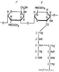 | Рис. 101. Структура псевдомуреина архебактерий: Г — N-ацетилглюкозамин; Т — N-ацетилталозаминуроновая кислота; глу — глутаминовая кислота; ала — аланин; лиз — лизин |