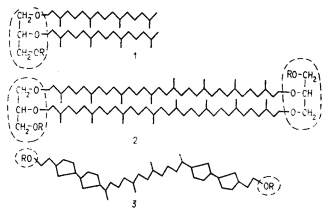 | Рис. 102. Липиды архебактерий: 1 — фитаниловый диэфир глицерина; 2 — бифитаниловый тетраэфир диглицерина; 3 — изопреноид из полярных липидов, содержащий пятичленные циклические группировки; обведены полярные области; R — остатки фосфорной кислоты или сахара |