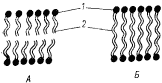 | Риc. 103. Схема бислойной и монослойной мембран архебактерий, образованных соответственно ди- (А) и тетраэфирами (Б) глицерина: 1 — молекула глицерина; 2 — углеводородные цепи разной длины (по Воробьевой, 1987) |