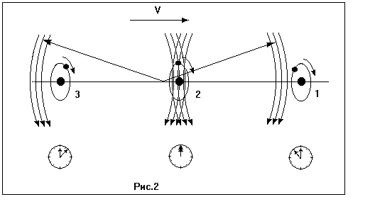 Ели бы все отрицательные заряды были здесь в верхнем положении, то на диполи 1 и 3 действовали бы силы, движущие их назад - в те участки поля, что показаны на рисунке. А их излучения оказались бы слева от диполя 2 - сзади, и на него тоже действовали бы такие силы. Кроме того, действовали бы силы, стремящиеся довернуть диполи в положения, показанные на рисунке 2. До тех пор, пока не сформируются временные интервалы, т.е. пока диполи не повернутся относительно друг друга, силы противодействия не исчезнут, и система не будет двигаться по инерции.